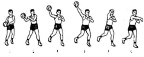 以右手传球为例。传球时,左脚向传球方向迈出半步,将球引到右肩上方,肘外展,上臂与地面平行,手腕后仰。右手托球,左肩对着传球方向,重心落在右脚上,右脚蹬地,转体,前臂迅速向前挥摆,手腕前屈,通过食指、中指拨球传出,如图7-4所示。