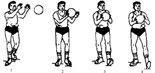 接球有双手接球和单手接球两种,不论是哪种,接球时眼睛要注视球,肩、臂都要放松,手臂要迎球伸出,手指自然分开。当手指触球时,屈肘,臂后引,缓冲来球的力量,两手握球,保持身体平衡,以便进行下一个动作,如图7-5所示。