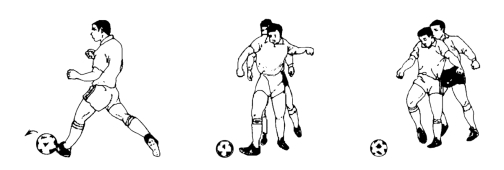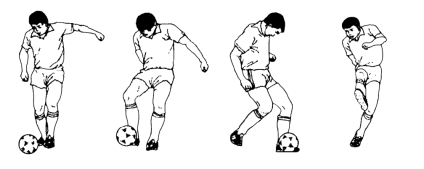 脚内侧推传球是传出准确的短距离地面球的最可靠技术。支撑脚应置于球的一侧,脚尖指向传球方向,支撑脚距球约15cm,应保证踢球腿的自由摆动。踢球脚在触球时,脚应外转并使脚内侧以正确角度对准传球方向。脚跟部要紧张并保持坚硬,触球时,头部要稳定,眼睛要看着球。为传低球,击球作用力要通过球的水平中线。完成触球动作后,球已滚向同伴或目标,若踢球腿的跟随动作与传球方向一致,则可保证传球的准确性。所以,触球后要有跟随动作,踢球腿的随摆与传球方向一致,如图9-1所示。