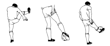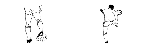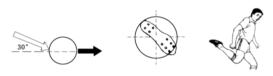 搓传时的助跑角度较小。支撑脚的位置比其他传球技术更靠近球,不足10cm。踢球脚的触球部位是更接近脚尖的脚背部分,踢球腿应有向下的插入动作,为了能使球产生后旋,踢球脚要搓踢球的底部。触球后,踢球脚即刻制动,几乎没有踢球腿的跟随动作。若要做较长距离的搓传,击球后,可把踢球腿的膝部迅速向胸部提起,如图9-7所示。