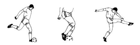 该技术最宜用于长距离传球。助跑仍是斜线方向,但角度可大可小。支撑脚的选位一定要在球的侧后方,触球时要使踢球脚的踝关节伸展并保持紧张,脚尖外指,击球作用力要通过球的垂直中线,触球的部位在球的中底部之间。要想传高球,击球点必须在球的水平中线以下,越接近底部,传出球的后旋越加剧且球速慢,但球会陡然升起。踢球腿在触球后要随出球方向继续上摆,如图9-6所示。