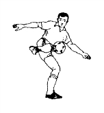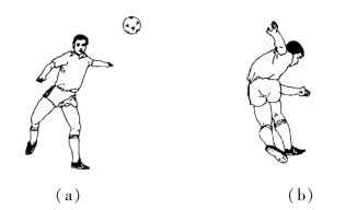 由于是正面射门,助跑肯定是从球的后面,支撑脚可以置于球的后方,这会保证踢球腿有足够的摆动空间。支撑脚可以前脚掌着地,以使踢球腿的膝部尽可能在球的上方时以脚击球。触球时踝部应紧张,脚尖朝下,击球作用力通过球的中上部,否则球会射高。为加大击球力量并确保部位,可等球下落至接近地面时击球,若防守队员就在附近,射门队员就得在球处于腰部高度时起脚射门,如图9-12(a)所示。射门后,踢球腿应继续朝球门方向摆动,头在射门过程中要保持稳定,眼睛应看球,如图9-12(b)所示。