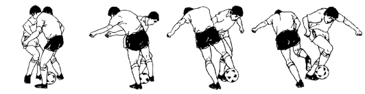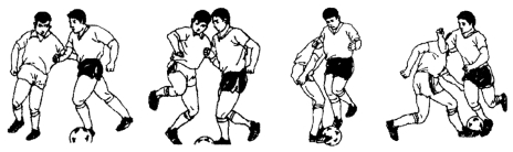 侧面抢球技术是与运球对手并肩跑动或从后面追平对手时采用的抢球法。在抢球前应尽可能地靠近球并设法使支撑脚立于球的前方,然后以支撑脚为轴转动身体,用抢球脚的脚内侧封阻球。还可以利用合理冲撞的办法实行侧面抢球行动,在对手失去平衡时乘机夺球,如图9-19所示。