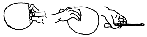 大拇指弯曲,紧贴拍柄的左侧用力下压,其余四指自然分开托住球拍的后面。正手削球时,尽量使球拍后仰,减少来球的冲力;反手削球时,拍后四指灵活地把球拍兜起,使拍柄向下,如图10-3所示。