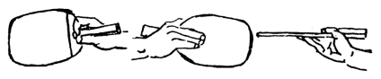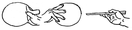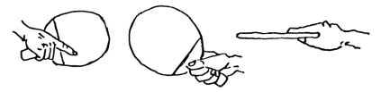 横拍的基本握法是:虎口贴拍,食指在拍前,拇指在拍后。这种握法又称为八字式,如图10-4所示。正手攻球时,食指稍向上移动,反手攻球时,拇指稍向上移动。