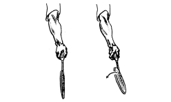 凡从身体左侧的来球,运动员应先转身(背对网)后用反手握拍法击球,如图11-2所示。反手握拍法即在正手握拍的基础上,拇指和食指将拍柄稍外转,拇指顶贴在拍柄内侧的宽面上。