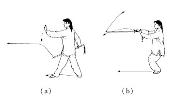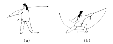 右脚向后撤步,左腿屈膝;左手持剑向前平举与肩同高,手心斜向下,右剑指向下后摆,与肩同高,手心向右;眼看前方,如图12-46(a)所示。重心后移,右腿屈膝半蹲,左脚稍后撤成虚步;左臂屈肘回收,左手持剑位于胸前,手心向右,右臂屈肘回收,右剑指位于胸前,手心向左,准备接握左手之剑;眼看前方,如图12-46(b)所示。