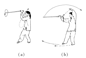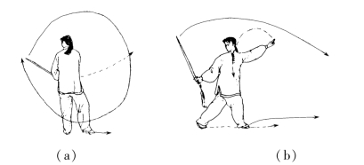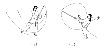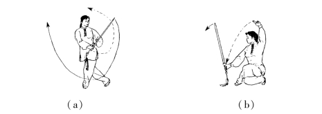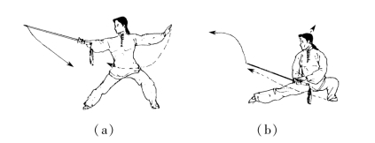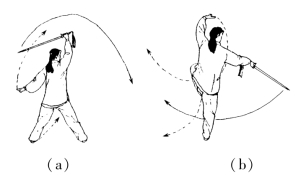 左脚向前上步,脚尖外展,随之身体左转,右脚随转体向体右侧摆起;右手握剑向上、向左下落,剑尖略高于头部,右手握剑于腹前左侧,虎口向上,左剑指下落附于右手腕处,手心斜向下;眼看左前方,如图12-59(a)所示。左脚蹬地起跳,同时右脚下落支撑站立,左脚向体后撩踢成望月平衡;右手握剑向下、向后直臂撩出,剑尖略高于头部,小指侧剑刃向上,左剑指向下、向左挑起,与头部同高;眼看剑尖,如图12-59(b)所示。