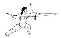 要点:左剑指下落与剑的上举要同时,剑的前劈与剑指要同时到位。