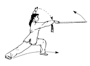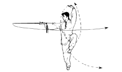 要点:上步、转体与平斩要协调一致,腰要向右拧转,剑、臂成一直线。