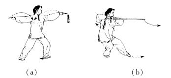 身体左转约90°;左脚随转体向前下落上步;右手握剑臂内旋扣腕,使剑提于胯旁,左剑指下落经右胸前向体前挑起,与肩同高,手心斜向前;眼看前方,如图12-55(a)所示。右脚向左脚并步,两腿屈膝半蹲;右手握剑向体前直刺,与肩同高,虎口侧剑刃向上,左剑指回收附于右手腕处,手心斜向下;眼看剑尖,如图12-55(b)所示。