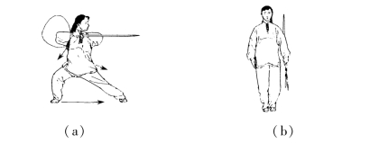 身体右转90°;同时重心右移,右腿屈膝,左腿膝关节伸直;右手握剑,右臂屈肘回带于体前,与肩同高,手心向里,左剑指下落附于右手腕处,变拳,准备接握右手之剑;眼看剑尖,如图12-63(a)所示。重心左移,右脚向左脚并拢,并步站立;左手接剑下落于身体左侧,手心向后,右手变剑指向下、向右抬起,再屈肘经耳侧直臂下落,手心向左;眼看前方,如图12-63(b)所示。