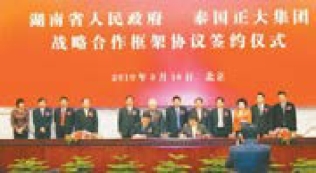 3月16日,省政府与正大集团在北京签订战略合作协议。正大集团将利用自己的技术、管理、市场优势,带动农民致富,带动当地经济发展,为当地提供更多就业机会,推动农业产业升级,为湖南新农村建设做贡献。