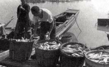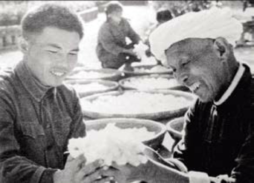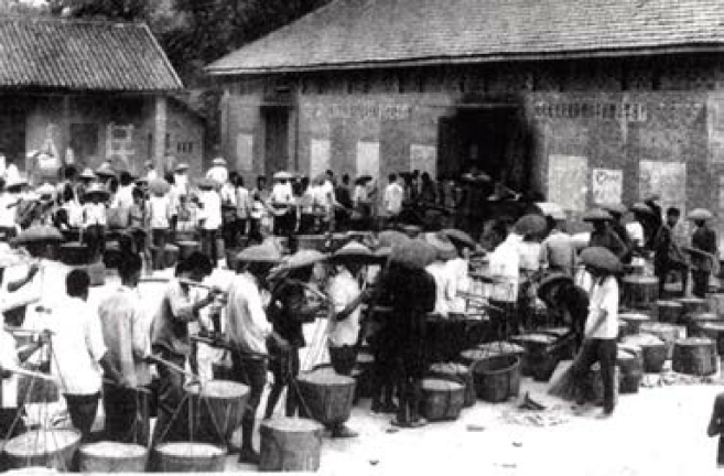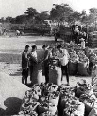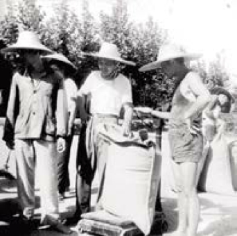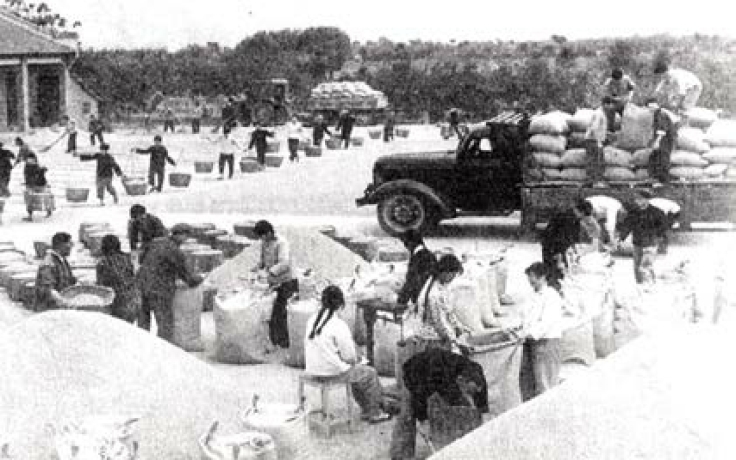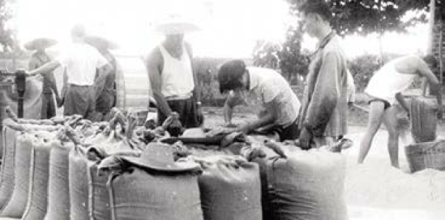 1973年,社员们忙着将粮食打包过秤,送给国家。