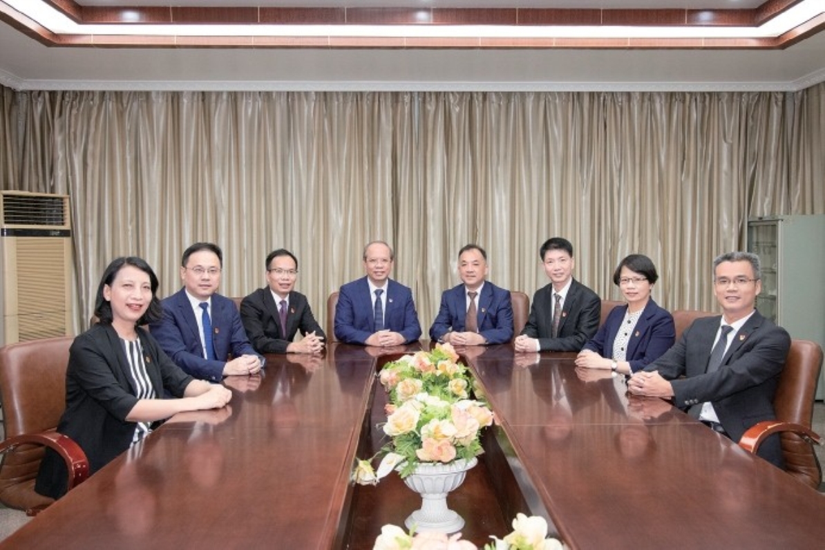 院领导班子合影,左起林槙槙副院长、林建清副院长、黄淑忠纪委书记、曾奕明党委书记、许建华院长、刘惠民副院长、曾红华副院长、李文聪总会计师