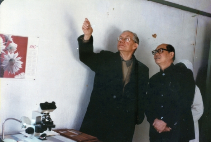 1985年,原惠世医院院长兰大弼博士在病理科查看病理切片