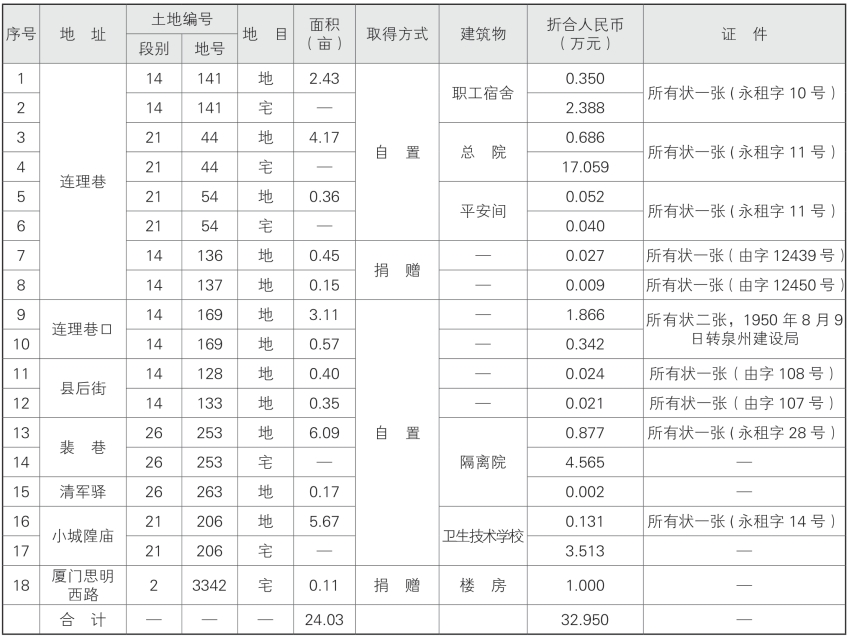 整个惠世医院时期,惠世医院及长老会先后购置的建筑及宗地等房地产共有以下几个区域。①连理巷:惠世总医院和惠世护士学校。②裴巷41号:先后作为惠世女院、惠世护校、隔离院的院舍。③小城隍庙姑娘楼:地址在镇抚司小城隍庙,是惠世医院英籍女医生和护士的宿舍楼(后期也有华人护士入住),1950年惠世护士学校曾迁往此处办学。④平水庙:惠世医院(含长老会)外籍男医师住宅,俗称“西人住宅区”。⑤厦门思明路:房屋1座,系1946年菲律宾妇女慰劳会捐赠的。上述房地产共有13块(房屋13座土地13块),其中房屋面积12.99亩,土地面积36.12亩。中华人民共和国成立后,惠世医院的英国医师和护士回国,政府接办惠世医院和惠世卫校,这几处房地产的产权及用途也相继发生变迁,连理巷和裴巷41号的所有院舍仍属医院,平水庙的西人住宅区由民警大队和晋江专区邮电局使用,小城隍庙姑娘楼先是由接办后的晋江卫生学校使用,后给泉州六中使用。1980年3月,国家开启中英两国政府有关香港回归的谈判,国务院、外交部根据英方要求,开展“有关清查核对英国在华房地产”专项调查,医院按省市要求也进行了核查,至今仍属医院使用的只有连理巷和裴巷两处,当时清查的房屋的建筑面积8.29亩,地产面积16.12亩。
