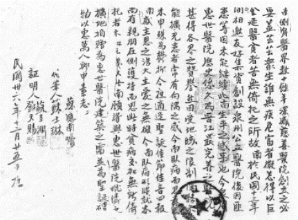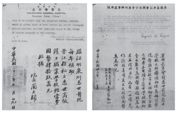 图1-1-1-9 1944年惠世医院及英国长老公会闽南分会向惠世护校的捐款证明
