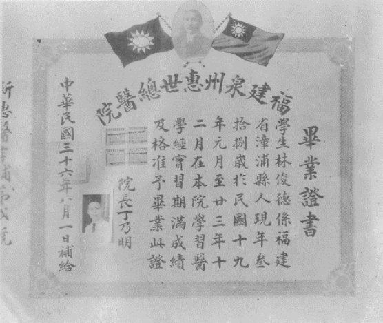 图1-1-6-1 1947年惠世医院补发的1934届学生林俊德的毕业证书