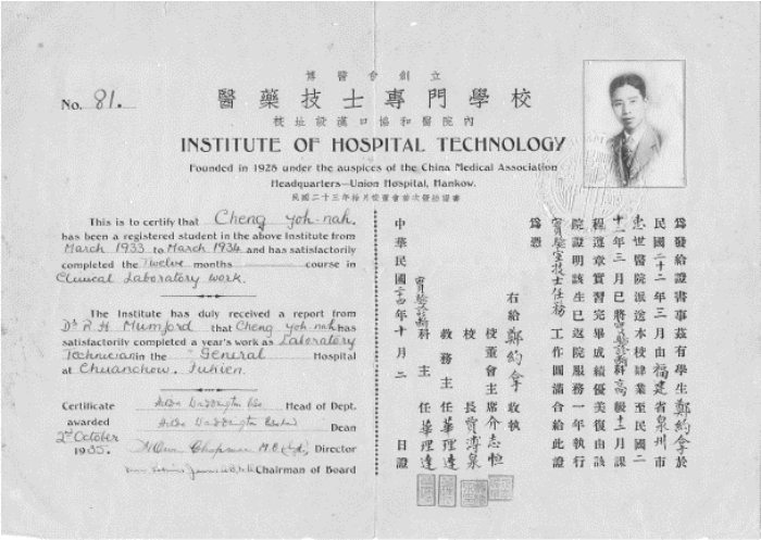 图1-1-6-2 1934年惠世医院郑约拿医生获得博医会医药技士专门学校的毕业证书