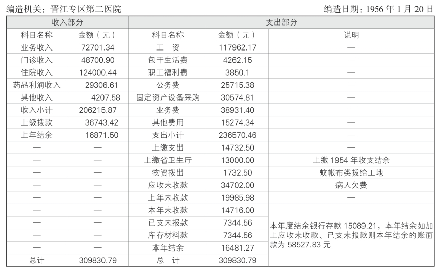 人民政府接办后医院的属性成为地区级的公立医院,当时处于计划经济时期,需要完成上级部门的各种指令。医院的运营经费有三大方面:其一主要还是来源于医疗业务收入及上年度的收支结余,其二为政府的财政拨款(只占10%~23 %),其三为医院的生产自给。医院每年下半年都要编制下一年度的经济预算(收入和支出都要进行预算),并向上级卫生和财政等主管部门呈报送审,有关部门根据预算的收支差额决定给予财政补贴和拨款。1954年医院业务收入194675.25元,上级财政拨款49500.00元(占业务收入的25.43%,占总收入的20.27%);1955年医院业务收入206215.87元,上级财政拨款36743.42元(占业务收入的17.82%,占总收入的15.12%),上年度(1954年)结余56871.50元;1957年医院业务收入332001.94元,上级财政拨款40700.00元(占业务收入的12.26%,占总收入的10.80%);1962年医院业务收入247038.53元,上级财政拨款74299.00元(占业务收入的30.08%,占总收入的23.12%)。