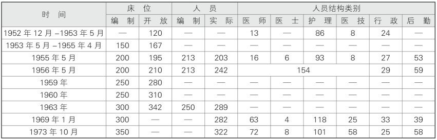 1953年全院在编人员共131人,其中行政人员24人、卫生技术人员107人。1955年5月,上级核定的医院人员编制213人,实际203人,其中医生16人(主任医师4人、主治医师1人)、医士2人、护理人员93人、技术员8人、行政人员27人。1960年医院卫生技术人员增至104人,其中医生21人,中专程度的技术人员83人。1963年编制人员250人,实际289人(其中临时工33人)。1969年1月全院职工总数为282人,其中医师67人、护士118人。1973年10月全院共有工作人员322人,其中卫技人员239人,行政后勤人员83人(见表1-2-3-1)。