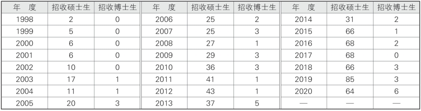 1994年医院首批两人获得福建医科大学硕士研究生指导教师资格,此后研究生导师数量不断增加。1998年开始招收培养全国统招硕士研究生、2003年开始招收博士生,至2020年共招收统招研究生684人,已获得硕士学位460人、博士学位26人(见表1-3-7-1);2015~2021届共有6名硕士研究生的毕业论文获评“福建省优秀硕士学位论文”。2016年获批国家人力资源和社会保障部博士后科研工作站,目前共并招收3名博士后进站研究。1997年医院成为福建医科大学首届同等学力硕士学位研究生课程教学点(附二班)。积极参与福建医科大学研究生学位授权点评估工作(见图1-3-7-1)。