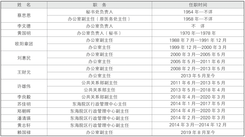 本节所载负责人包括秘书处、公共关系部、东海院区