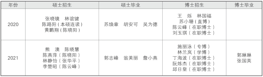 2020年,张华平获福建医科大学呼吸内科专业型硕士生导师资格;陈晓阳晋升为福建医科大学内科学副教授;陈晓阳不再担任福建医科大学第二临床医学院内科教研室副主任,由吴炜景接任;培训21名进修医生,包括专修学员3人、介入单修学员13人,肺功能单修学员4人,新招收3名PCCM专培医师进入基地培训。