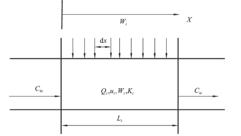 设某河段i长为Li,其水质目标为Csi,设计流量为Qi,设计流速为ui,设计断面面积为Ai,入流断面设计水质为C0i,污染物降解系数为Ki;同时,设该河段的纳污能力为Wi,则单位河长纳污量应为Wi/Li。建如图2-8中所示的坐标系,在河段内选一微分长度段,长为dx,坐标为x。那么,此微分长度段污染物输移至x=Li处的剩余质量可以采用式(2-33)计算求得。