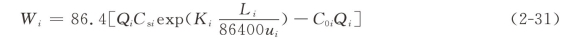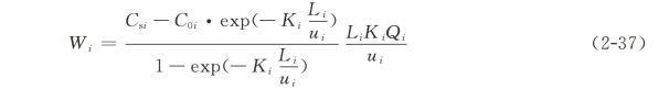 设某河段i长为Li,其水质目标为Csi,设计流量为Qi,设计流速为ui,入流设计水质为C0i,污染物降解系数为Ki;又设纳污能力为Wi。由于简化后的排污口位于河段上游边界,设排污口对河段上游边界的浓度贡献值为,则得到式(2-28):