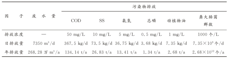 规划区排放的生活污水和工业废水的主要污水污染因子为COD、SS、氨氮、总磷、动植物油、粪大肠菌群等,按一级A标准浓度计算,得到规划区各种水污染物的排放量,结果如表4-13所示。