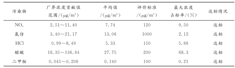 对于氯仿、HCl、醋酸、醋酸甲酯、二甲胺等仅有短期浓度限值的污染物,其叠加后短期浓度均符合环境空气质量标准。