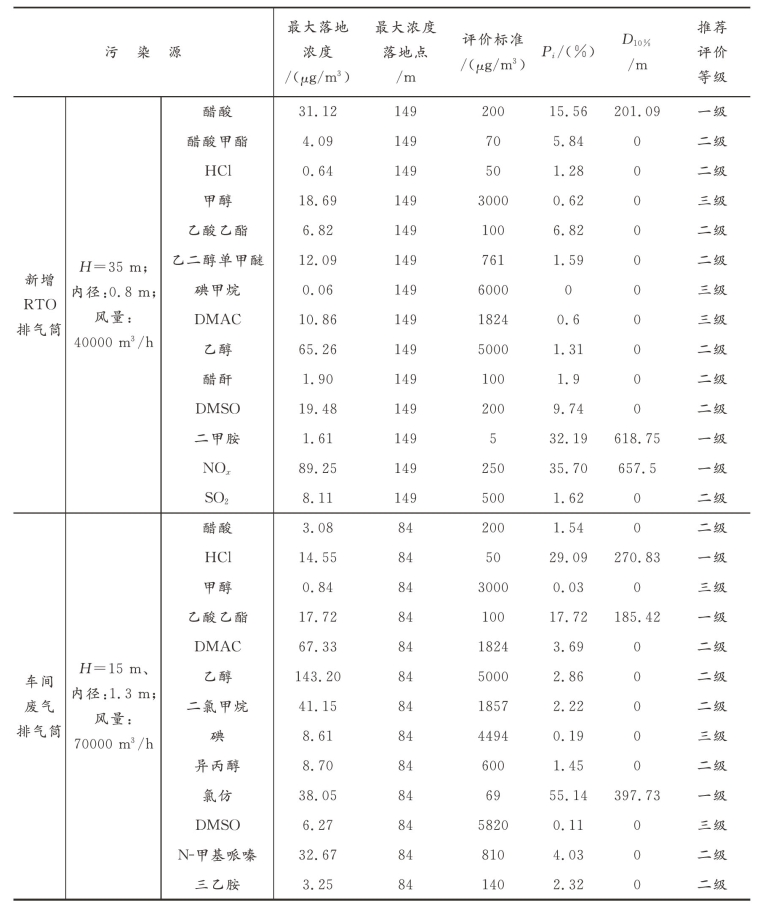 根据表4-22所示的新增RTO排气筒污染源和车间废气排气筒污染源排放的主要污染物占标率大小可知,该技改项目的大气环境影响评价因子为:NOx、氯仿、HC1、醋酸和二甲胺。