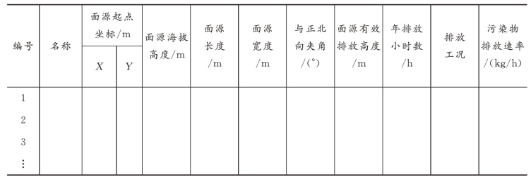 应选择所有的环境空气敏感区中的环境空气保护目标作为计算点。因此,计算点可以是环境空气敏感区、预测范围内的网格点,或者是评价区域内最大地面浓度点。点源和面源的各种参数,通常采用表4-24和表4-25所示的污染源参数清单表述。