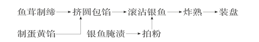 原料:小银鱼350克,白鱼茸250克,花椒粉2克,精盐3克,姜葱汁10克,熟咸鸭蛋黄4只,熟猪板油150克,绍酒15克,细葱末15克,细火腿茸5克,鸡粉3克,鸡蛋2只取清,干淀粉150克,精炼油1000克(耗100克)。