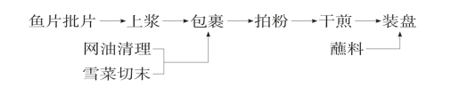 (1)上浆:将鱼去皮及胸刺,批4厘米×2厘米×1厘米长方块,用绍酒、雪菜汁、味精、胡椒粉、绵白糖、葱末拌匀起黏,用鸡蛋与干淀粉15克上浆。雪菜梗切细末待用。
