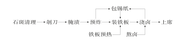 (2)加热:将锡纸做成窝状,内置炸后的石斑鱼,将炒锅上火,下清油50克、果汁辣沙司、鱼露、酒酿、味精1克、酸辣酱油、美极鲜、香醋、红油、绍酒及适量水烧沸,勾流利芡浇在鱼身上,包起锡纸封口,放在烧得将近发红的铁板上上席。
