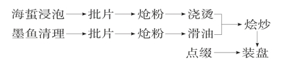 (3)烩炒:①用沸水对海蜇浇烫,但不能使之收缩。②用160℃油温将墨鱼片滑油,变色即起滤油。③用鸡汤、绍酒、胡椒、文蛤精粉、湿淀粉做兑汁芡,与鱼片、海蜇一同下锅快速翻炒包芡。另用25克140℃热油冲葱末起油花,迅速与珊瑚酱片拌匀做包尾油即成。