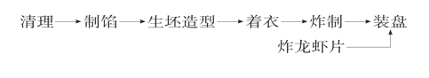 (3)生坯造型:①将网油拍干淀粉,拌匀葱椒盐蛋浆、包馅心成圆锥形,在尖部装上凤尾虾仁(露1/2在外)。②用鸡蛋清与面粉和成蛋清糊遍抹锥体,再均匀滚沾上面包糠,最后用绿笋丝在锥体中间扎紧成葫芦状生坯。