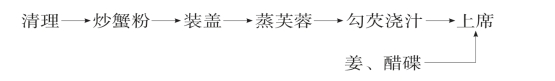 (2)炒蟹粉:用清油50克,将姜、葱末略煸起香,下蟹粉煸炒出香,调入绍酒、精盐、白胡椒,炒透入味。