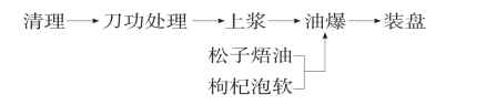 (3)油爆:①将松子用120℃油温焐油成熟,待用。②将鱼片与枸杞子一同用180℃油温急炸3秒钟至熟如龙爪样。用精盐、绍酒、芝麻油、鸡精、胡椒、勾兑成汁芡,将爆熟的鱼片与芡汁一同下锅,迅速翻炒勾包汁芡即可。