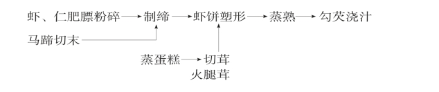 (3)蒸熟成菜:将虾饼入笼沸水蒸约2分钟成熟出笼,用100克鸡汤、2克咸桂花、2.5克湿粉、1克精盐、熟猪油、1克鸡粉、2.5克湿淀粉勾流利芡,浇在虾饼上即成。