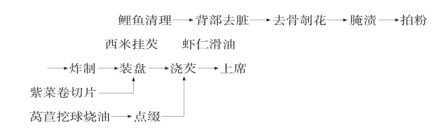 (1)鲤鱼处理:将鲤鱼去鳞、鳃、脊开去内脏,洗净、去脊、肋骨,在肉面剞鱼鳞花纹,深度至皮。用盐2克及姜、葱、绍酒腌渍10分钟。紫菜卷切大片待用,莴苣挖成1厘米球20只。