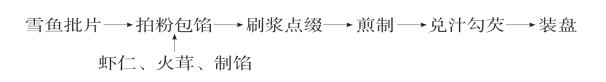 (2)生坯成型:①将雪鱼批成10张7厘米×5.5厘米×0.2厘米的薄片,遍拍干淀粉。②将虾馅分装在鱼片中,顺长对折,修折口两侧呈月牙形,中间隆起,前侧压住虾馅。③用1只鸡蛋取清,加10克湿淀粉调成浆,遍涮鱼夹两面。④将香菇批薄,青椒去籽批薄,与火腿均切成1厘米边长的菱形片各10片,三片相夹,将三色片贴附在鱼夹1面。