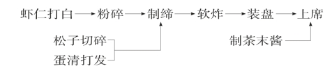 (1)制缔:将虾仁打白,吸干表水,粉碎成茸,加2克精盐与绍酒搅拌起黏,分2次加入发蛋(5只,鸡蛋量)拌匀。将松子切成米粒状,与干淀粉、鸡粉1克一道调入虾缔定质定味。