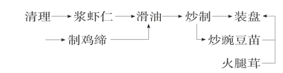 (3)成熟:①热锅温油,油温120℃下鸡缔一边加热一边用手勺轻推出碎块状浮起,倒入漏勺滤油待用。②将虾仁用同法滑油。③将豌豆苗炒熟围边。④将鸡茸与虾仁一同炒熟勾芡盛在豌豆苗中,撒上火腿茸即可。