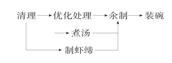 (2)优化处理:①将大鲫鱼浅剞花刀,用盐3克遍擦鱼皮。②将虾仁与猪肥膘分别粉碎,加蛋黄、酒、盐、淀粉、味精、葱姜汁混合搅拌成虾缔。③将炒锅上火,用猪油将姜葱略煸出香,下1000克毛汤,干贝、虾籽、小鲫鱼,旺火煮至汤色浓白,过滤去小鱼等。