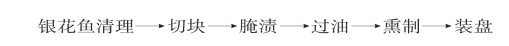 (1)初加工:将银花鱼刮鳞,由鳃口卷出内脏洗净,钭刀切成10块,用盐、绍酒、花椒粉、姜及葱10克腌渍10分钟,加酱油拌匀。茶叶泡湿待用。