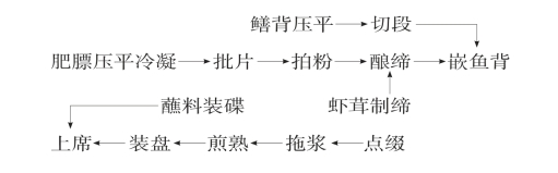 (2)生坯造型:将肥膘片平置盘中,上酿虾缔约1厘米厚抹平,再将鳝背平铺在虾缔上压平,将余下的虾缔薄薄地蒙在鳝背上。用红椒、香菇、香菜叶点缀成小花。